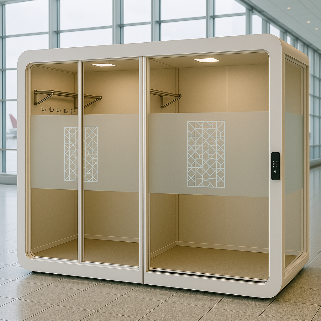 Flexibly built, Salah Pods fit effortlessly indoors or outdoors, preserving safety, privacy, and durability in terminals, malls, and campus walkways.
