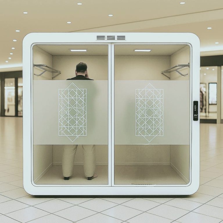 Flexibly built, Salah Pods fit effortlessly indoors or outdoors, preserving safety, privacy, and durability in terminals, malls, and campus walkways.